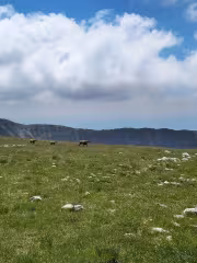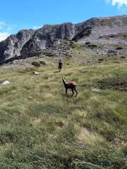 After taking plenty of photos, we sat down for a lunch break and a bite to eat to recharge for the descent. We decided to go down via the standard route through Kabata. The descent from the summit to Kabata is, to put it mildly, tedious because of the loose rocks. We descended fairly quickly, and at the saddle we were greeted by a herd of wild goats that have become so accustomed to people that they do not run away and allow close photographs. There were also baby goats. On the rocks along the trail we spotted a few more edelweiss that had not yet bloomed.