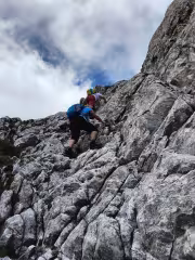 Mitaka and I were a bit faster, so at the turnoff for the ridge we waited for Achkata and Sofi to catch up, and together we headed upward along the path. We reached the first rock section and began climbing. Near the end of this first rock we slightly bypassed the final part, as it is quite risky without protection (I have yet to see anyone not avoid that exact spot).