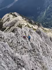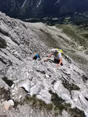 Overall, the rock section is not extremely difficult. There is only one slightly more challenging passage, but there is a fixed piton there that can be used as a foothold. Sofi, being shorter, had some difficulty at this point, but with a bit of determination managed to pass it. Around there I overtook them and started photographing them from above as they climbed.