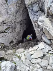 We had already passed the harder section, and Mitaka was waiting for us up on the ridge. Gradually scrambling upward, we reached him. From there to the summit of Vihren there is nothing complicated, and elevation is gained relatively quickly. We made a short detour to show them a cave located about ten meters off the trail.