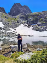 Some of the group stayed to relax near the lake, while the rest of us headed to the upper Malyovitsa Lake, the second largest, at 2,368 meters elevation. After taking a few photos, we continued upward along a path that reaches a ridge above the lake. There is a kind of junction here: one trail climbs the gully toward the saddle between Orleto and Malyovitsa, another heads toward the Urdini Cirque, and a third leads to nearby Ushite Peak.