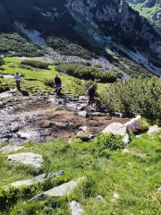 The trail to Malyovitsa Hut follows the standard route, and this time it took us about an hour to reach it. We waited on the benches in front of the hut for everyone to gather, refilled our water bottles (which turned out to be unnecessary, as there were plenty of streams higher up), and prepared to continue along the so-called Rabbit Trail.