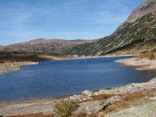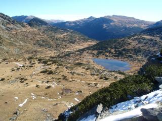 За около час достигнахме до смрадливото езеро и установихме, че засушаването тази есен доста е смалило езерото, дори го е разполовило. Тъй като духаше силен вятър се сгушихме в едни клекове и закусихме на брега на езерото, след което поехме по пътеката към Рибни Езера. Предния уикенд беше валяло сняг и на по-усойните места все още имаше малко сняг, колкото да е хлъзгаво и неприятно за минаване. Но без инциденти достигнахме до х.Рибни Езера още по обедно време.