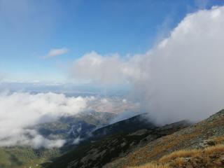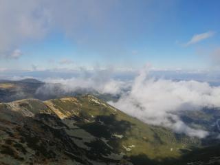 За нещастие 10-тина минути преди да стигнем върха се появиха облаци, които ни обгърнаха. Застудя! И въпреки че на върха останахме около половин час, то облаците само за няколко кратки мига се отдръпнаха и ни позволиха да видим нещо в низините северно и източно от нас.