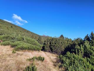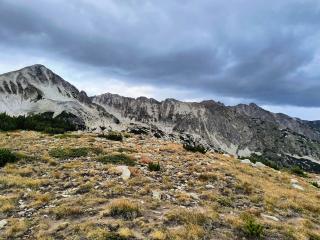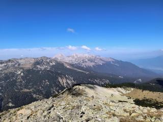 След Каймакчал продължихме до полянката, преди да захванем ръбчето и улеят, които да ни изведат точно под Голяма Стража. Точно по ръба нямаше как да минем, та се наложи леко да слезем по надолу от към западната страна. Имаше нещо като оформена пътечка, а и насложени каменни пирамидки за ориентация.