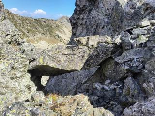 Вече достигнали улеят под върха бързо напреднахме нагоре и излязохме на една премка между Голяма и Малка Стража. Поумувахме малко дали директно да катерим нагоре. Там в този участък преди време е имало въже, ама сега го нямаше и беше малко рисково от там да се качим. Та затова слезнахме 50-тина метра надолу по улеят от другата страна до едно място, което що годе беше добро за откатерване.