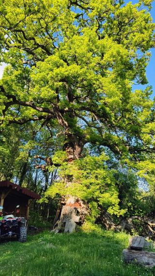 На около 500 метра от селото минахме покрай един изграден навес до който има впечатляващ вековен дъб, а в основите на самият дъб има каменен кръст също на няколко стотин години. Там също спряхме за кратка почивка и снимки, след което бързо се върнахме при колите и поехме обратно към дома.