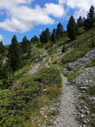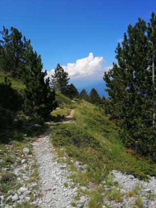 Общо взето масовата практика е да се качи върха по червената марка и да се слезе по синята, като се ползват преките пътеки. Така направихме и ние. Поехме по стръмната пътека и бавно започнахме да набираме височина, на едно място се преминава през оголен склон и има хубава гледка към южен Пирин.