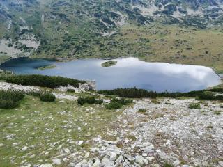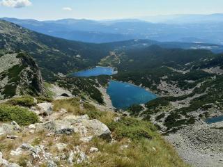 Вече започнахме да срещаме хора, няколко групички правещи кръгов маршрут около Канарата. Спирахме за кратко да си поговорим преди да продължим по тясната на места пътека. Стигнахме до превала между двата върха и пред нас в ниското се откриха Рибните езера и хижата разположена между двете езера.