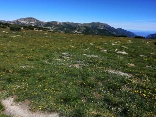 Върнахме се на маркираната пътека и леко и бързо спуснахме до превала над баненските езера, в най-ниската точка на превала имаше плитко езерце, по-скоро гьол около който на паша беше стадо коне с няколко малки жребчета. Поснимахме ги и продължихме леко да изкачваме към следващото възвишение. Видях на картата, че на спускането от другата страна на възвишението има отбелязана чешма, така че решихме там да е обяда.