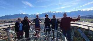 Горе естествено си направихме обща снимка, както и няколко красиви панорамни снимки. Както писах, денят беше с много хубаво и ясно време. Наблизо до панорамната площадка имаше изградено нещо като много миниатюрен амфитеатър с дървени пейки и мини сцена. Там групата се наслади на акапелното пеене на Луиза, който ни обещаваше такова изпълнение от известно време и най накрая се нави да ни покаже певческите си възможности.