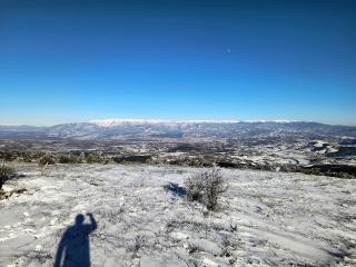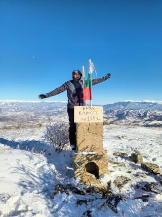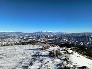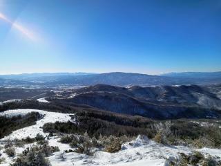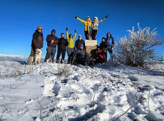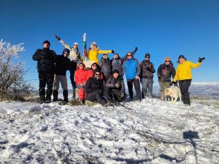 На самият връх подухваше лек но леден вятър, така че си намерихме местенце на завет малко под върха, където да се полюбуваме на гледките и да изчакаме групата да се съберем за обща снимка. А гледките в този ден бяха изключителни, времето беше слънчево и ясно и се виждаше надалеч.