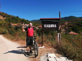 В село Кашина седнахме в местното кръчме, ако може така да се нарече, при Бай Митко. Пихме по бира и се отправихме към водопад Скоко. До него оставаха още 2,5км по черен път, само на едно място бутахме колелата, и докато бутахме се натъкнахме на интересна табела гласяща: „Всеки човек трябва поне веднъж в живота си да избута лодка през планината“, това истински ни разсмя. Оказа се че е цитат на Вернер Херцог.