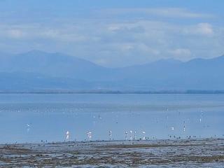 Малко по-нататък в северна посока най-накрая успяхме да видим 4 розови фламинго крачещи из плитката вода. За съжаление с телефона на приближение не стават хубави снимки, а птиците бавно се отдалечаваха от нас навътре в езерото.