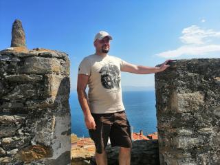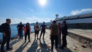 Но пък гледките от стените и кулата на крепостта към Кавала, морето и остров Тасос са уникални, заслужава си човек да посети това място. За обща снимка се събрахме на върха на кулата, до който достигнахме по тясно каменно стълбище, в което едвам се събрах предвид че съм по едър.