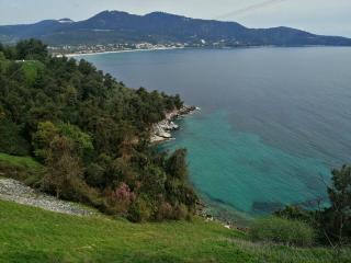Между Лименас и Потамия пътят не следва крайбрежието, ами има едно стръмно изкачване през баирите и след това стръмно спускане към морето. Изкачването е 5км с малко над 300 метра денивелация. В най-високата точка спряхме да се изчакаме, преди да спуснем. От горе имаше хубава гледка към Лименас.