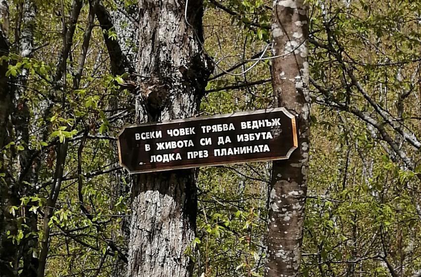 След като починахме и хапнахме дойде ред на стръмното изкачване от близо 2км, което аз избутах. В началото на изкачването са сложили табелка с много удачен надпис цитат на Вернер Херцог: „Всеки човек трябва веднъж в живота си да избута лодка през планина“.