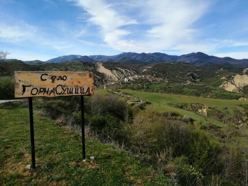 Отново кратка почивка да похапнем и започнахме да спускаме към Горна Сушица по черен път. Вече в селото имаше стар асфалт, който ако следвате ще се спуснете в село Ласкарево. Ние спряхме при табелката на селото за снимка и малко след това отбихме в ляво по черен път, който ни спусна до асфалтовият път и точно на разклона, който е за Мелник, Виногради и Лозеница.