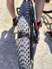 Точно там на отбивката се събрахме и се видя, че на Росен безкамерната гума се е изцуцолила и няма да издържи дълго време преди да се пръсне. За втори път му се случва да има проблем с безкамерна гума и отново не си носеше резервна вътрешна вътрешна, което според мен е задължително, независимо дали караш без вътрешни гуми ли със. Намерихме временно решение на проблема като превързахме гумата с медицинска лепенка и отгоре затегнахме допълнително с 2 връзки за обувки. Свърши работа, гумата успя да издържи чак до другия ден и се пръсна чак като се спуснахме в Симитли.