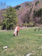 Така че след като Мишето се поуспокои поехме по пътя надолу към село Брестово и Коматинските скали. Пътят е много хубав, добре заравнен и с лек наклон, истинско удоволствие да се спускаш по него. По пътя има една изоставена застава, над която има направени няколко гьола, в които се отглеждат шарани. Там поседнахме за обедна почивка.