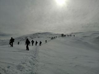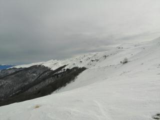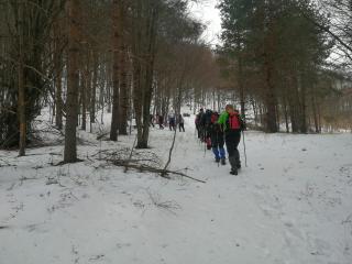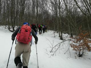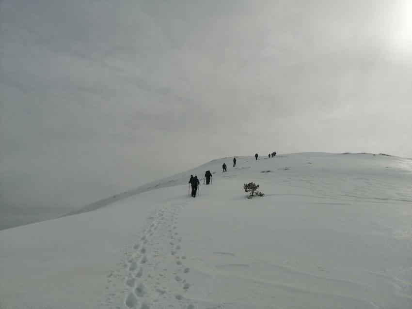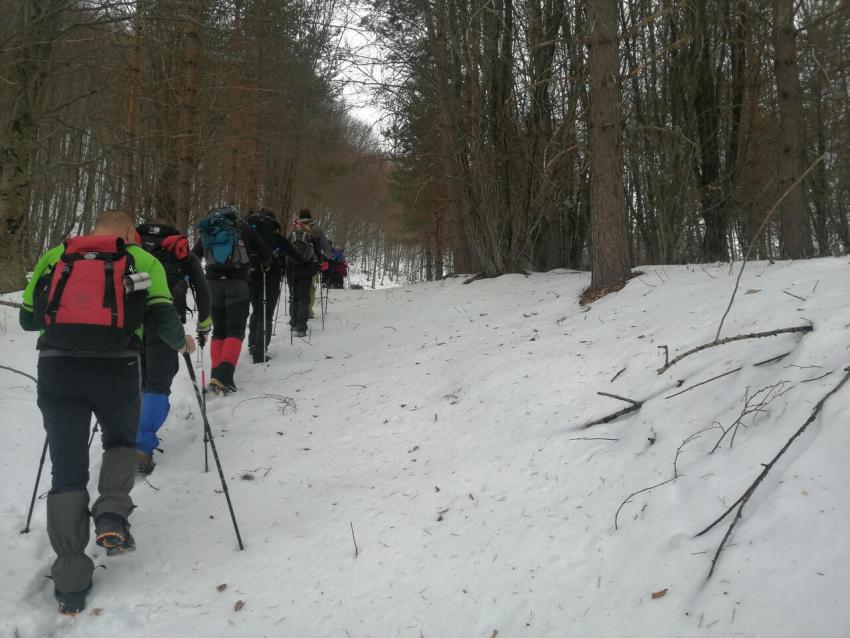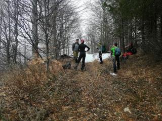 От тази сборна точка продължихме пеш нагоре по заснежен дърварски път, като в един момент хванахме право нагоре през гората докато стигнем друг път. Така на няколко пъти по път и директно през гората, докато не излязохме от гората, малко под самият връх Радомир.
