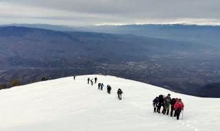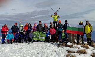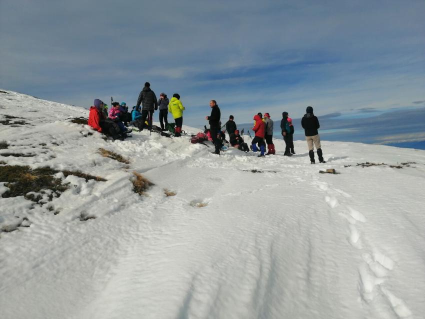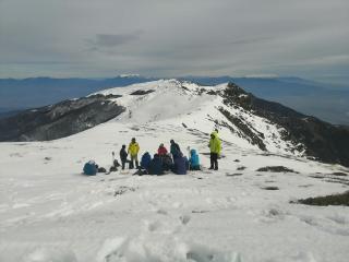 След една така сравнително дълга обедна почивка с тестване на домашни убавини като пастърми, луканки, сланина, ракийка и винце се строихме на връхната пирамида за обща снимка, и след това поехме по обратният път надолу. Снегът се беше поразмекнал и слизането не беше много по-бързо от изкачването.